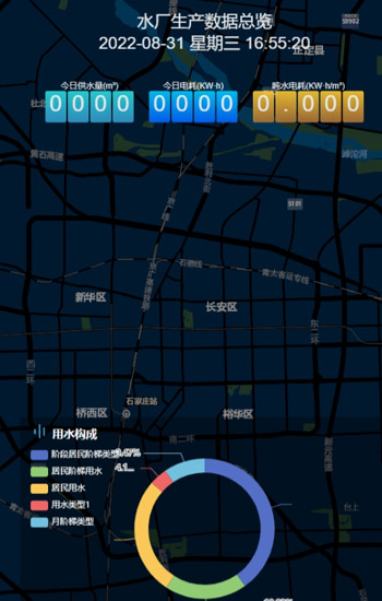 出水壓力監控、水質采樣監控、液位監控、藥耗監控、取水量監控、用電量監控、電量、電壓、功率監控、千噸電耗監控、瞬時流量監控、累計流量監控
