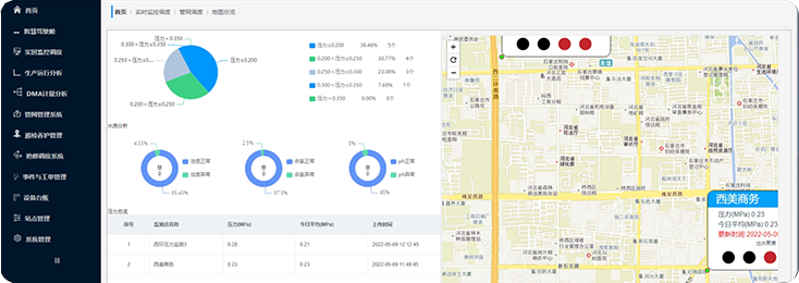 分組分層展示、分類展示、報警展示、圖層控制、管點管線查詢、管線管點與設備查詢、管線管點與設備統計